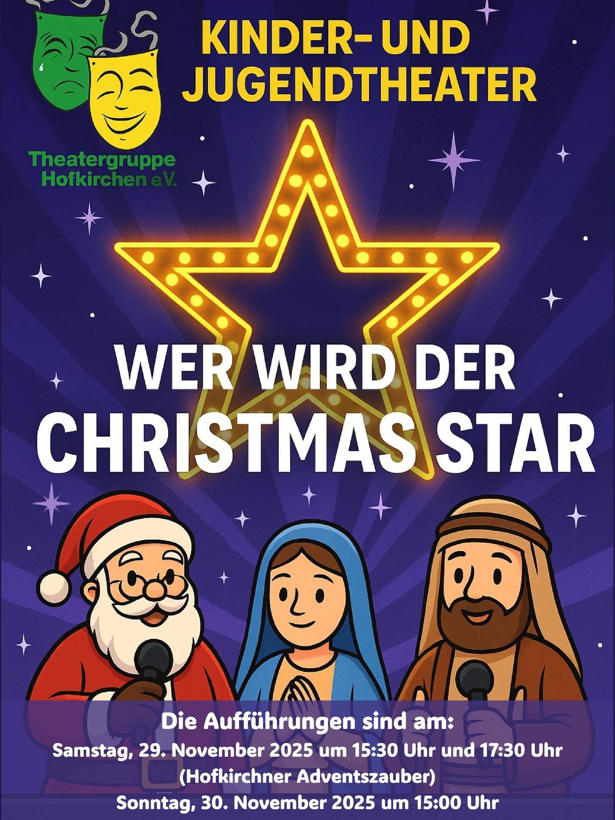 Die Kinder- und Jugendgruppe der Theatergruppe Hofkirchen e.V. führt das Stück "Wer wird Chrismas Star" im Rahmen des 5. Hofkirchner Adventzauber am 29. November 2025 sowie am 30. November 2025 im Saal des Bürgerhauses "Alte Schule in Hofkirchen auf.